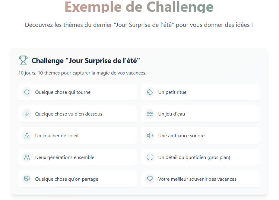 Les challenges sont là pour vous inspirer à filmer votre quotidien. Rejoignez l'aventure sur Instagram et relevez les défis pour tenter de gagner des lots et encore plus de films souvenirs !