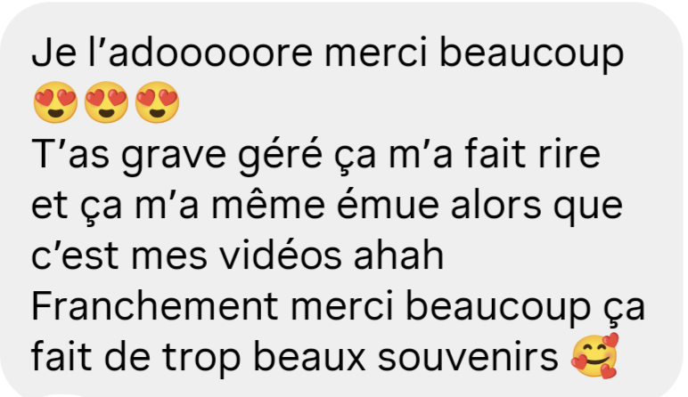 Vous récupérez les photos et vidéos de la personne, et je crée pour elle un film personnalisé à offrir le jour J.